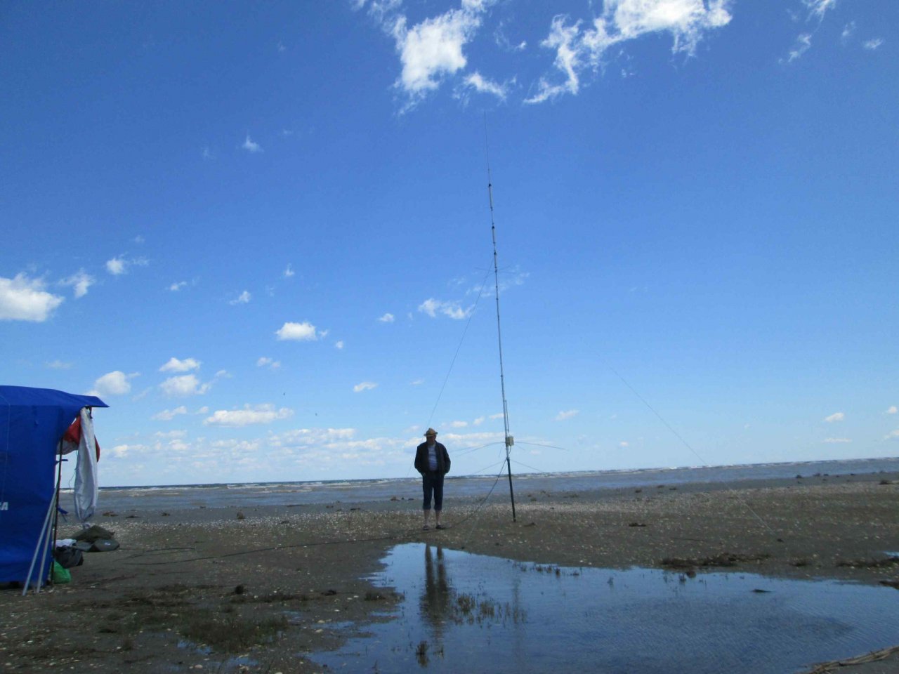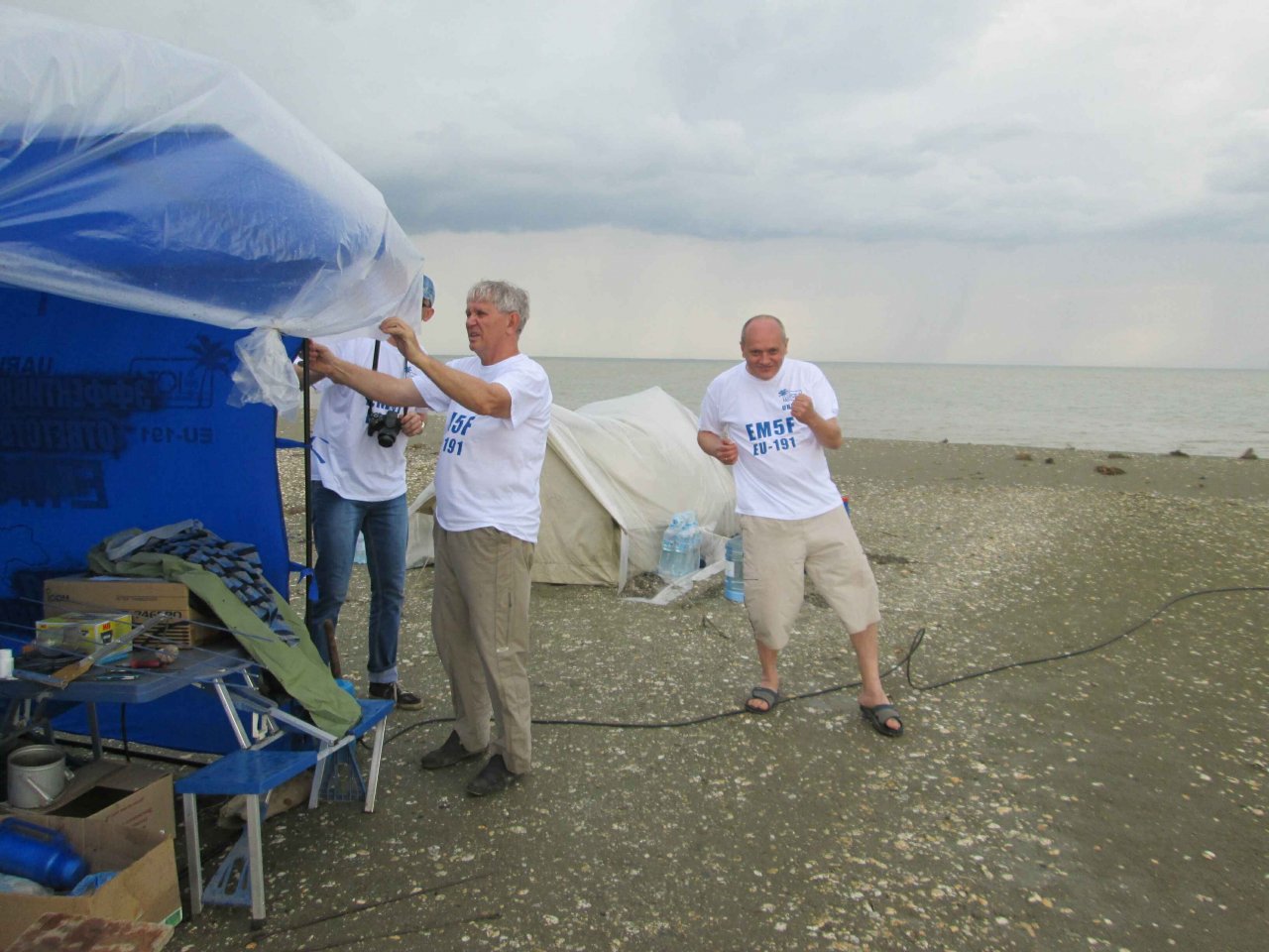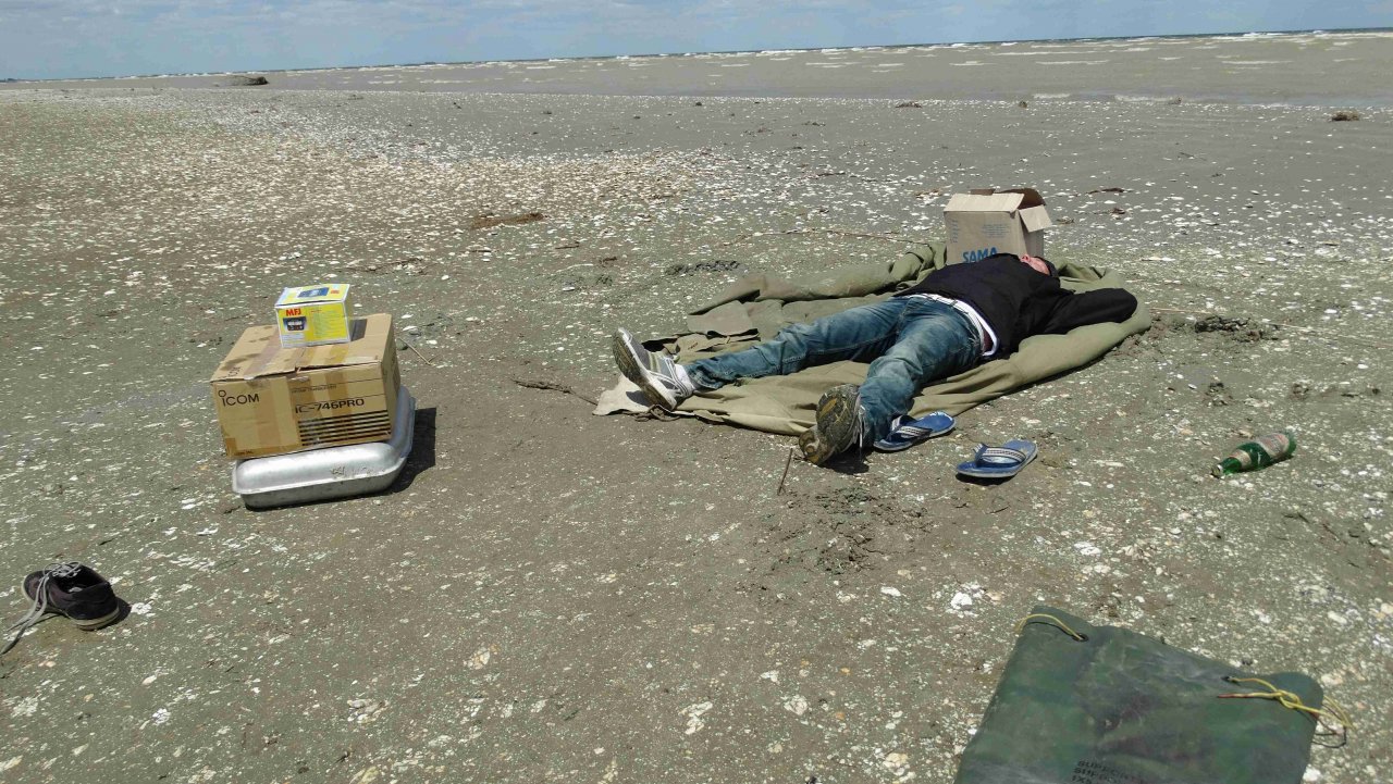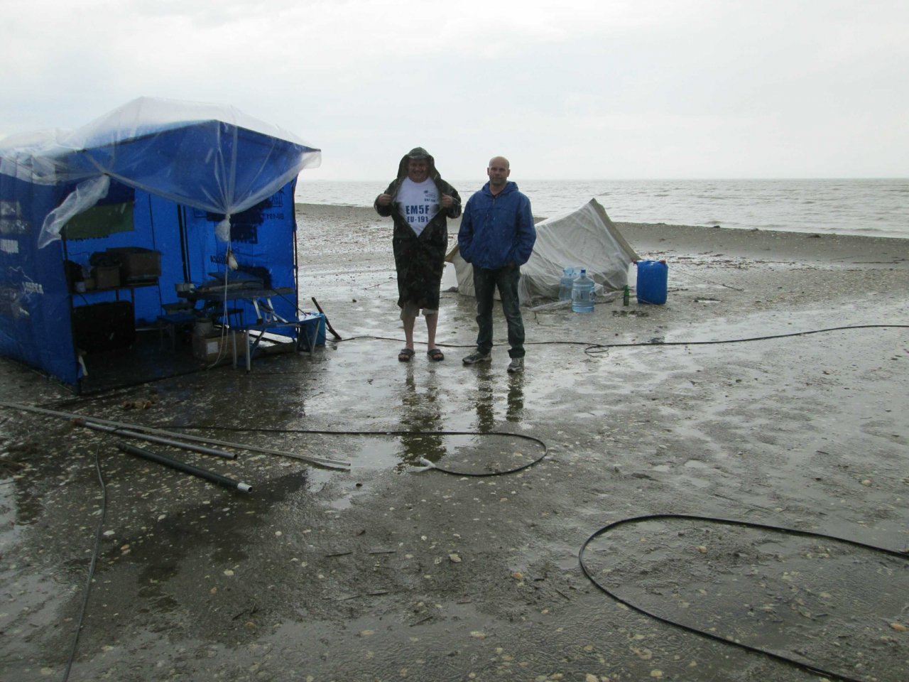 Борис UT7UT и Александр UR5FAV увлечены работой в эфире и удерживанием «шэка», и тут... В начале 6-ти утра нас поднимает Александр со словами: «Господа! Остров уходит под воду!». Выползаем из палатки и обнаруживаем, что с моря ветер поднял волну, и волны местами перекатываются через остров, а брызги летят как из пожарного гидранта. Остров весь мокрый, вокруг куча луж и вода не успевает уходить в песок или стекать обратно в море. Едва успеваем вырвать все колышки от спальной палатки и перетянуть ее ближе к «шэку».