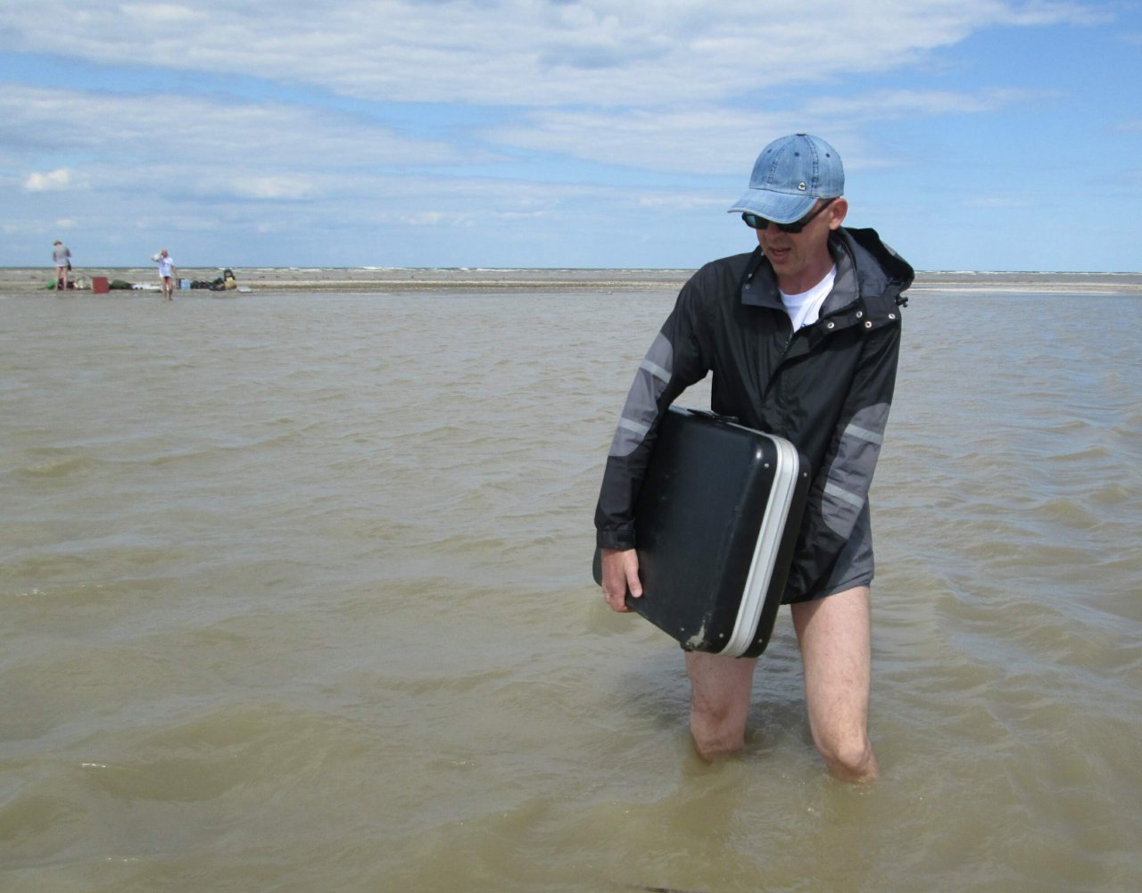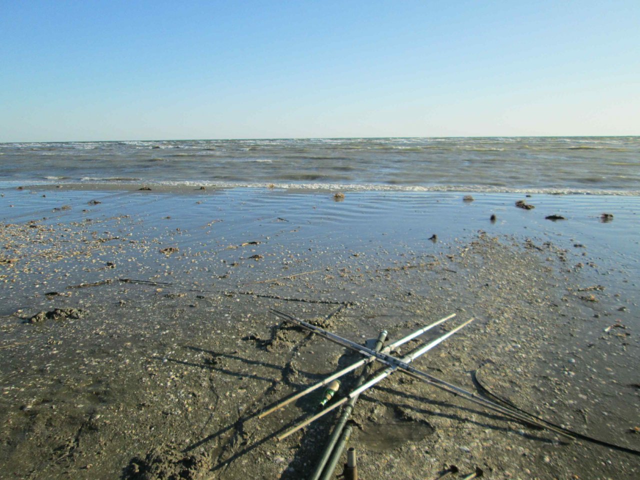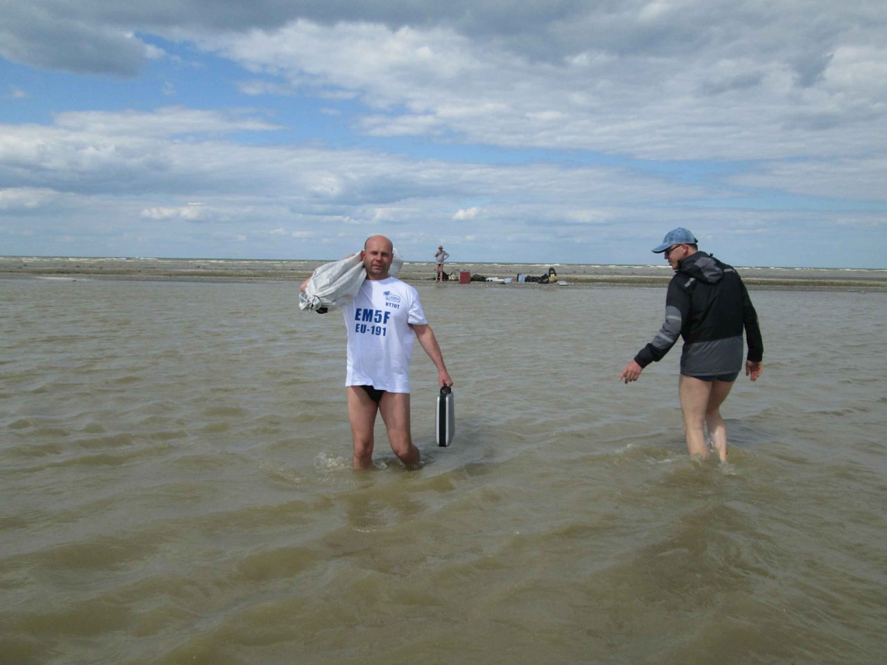 Борис UT7UT и Александр UR5FAV увлечены работой в эфире и удерживанием «шэка», и тут... В начале 6-ти утра нас поднимает Александр со словами: «Господа! Остров уходит под воду!». Выползаем из палатки и обнаруживаем, что с моря ветер поднял волну, и волны местами перекатываются через остров, а брызги летят как из пожарного гидранта. Остров весь мокрый, вокруг куча луж и вода не успевает уходить в песок или стекать обратно в море. Едва успеваем вырвать все колышки от спальной палатки и перетянуть ее ближе к «шэку».