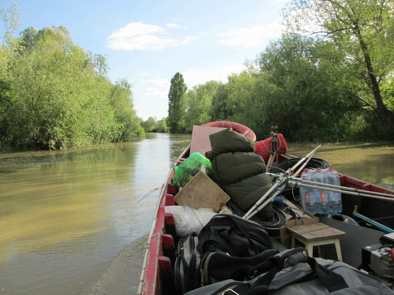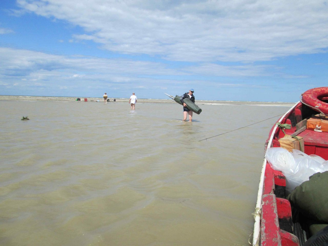 Вызваниваем нашего капитана и начинаем все готовить к погрузке. Ветер стихает до терпимого уровня. Но капитан даже при таком ветре вынужден снять тент на лодке и идти к нам почти на час дольше. К 16:30 часам по Украине лодка уже подошла на место швартовки. Прибывшая вода все равно не позволяет хоть на несколько метров подойти ближе к острову, и остаются все те же 80 м. пути по воде... Ветер постоянно тягает лодку по сторонам и это затрудняет процесс погрузки. Сказывается бессонная ночь, и перетаскивать все назад приходится еще и при большем уровне воды. Но, опять удается все перенести без потерь. Позже, правда, выясняем, что где-то при погрузке выронили и очевидно утопили «мобилку» Александра.