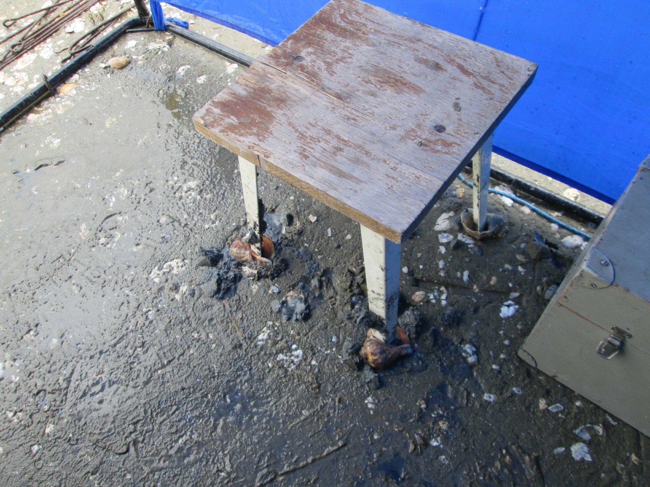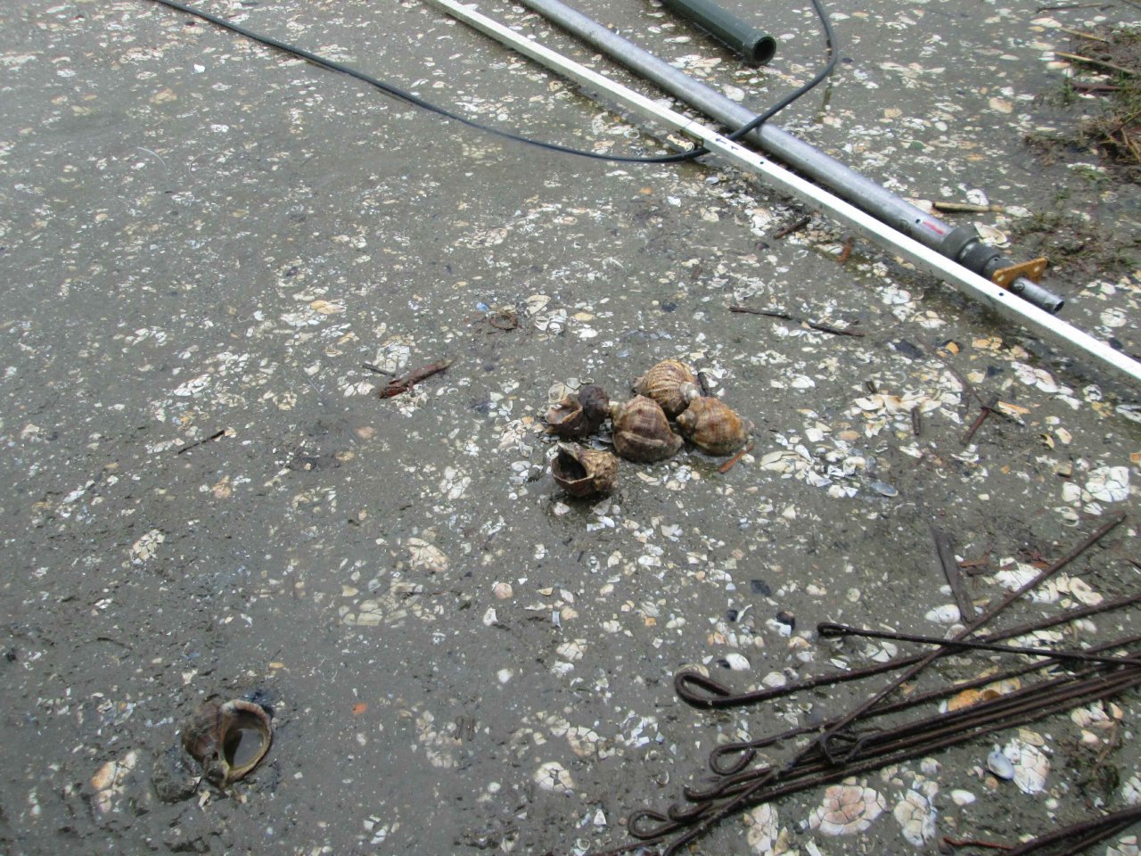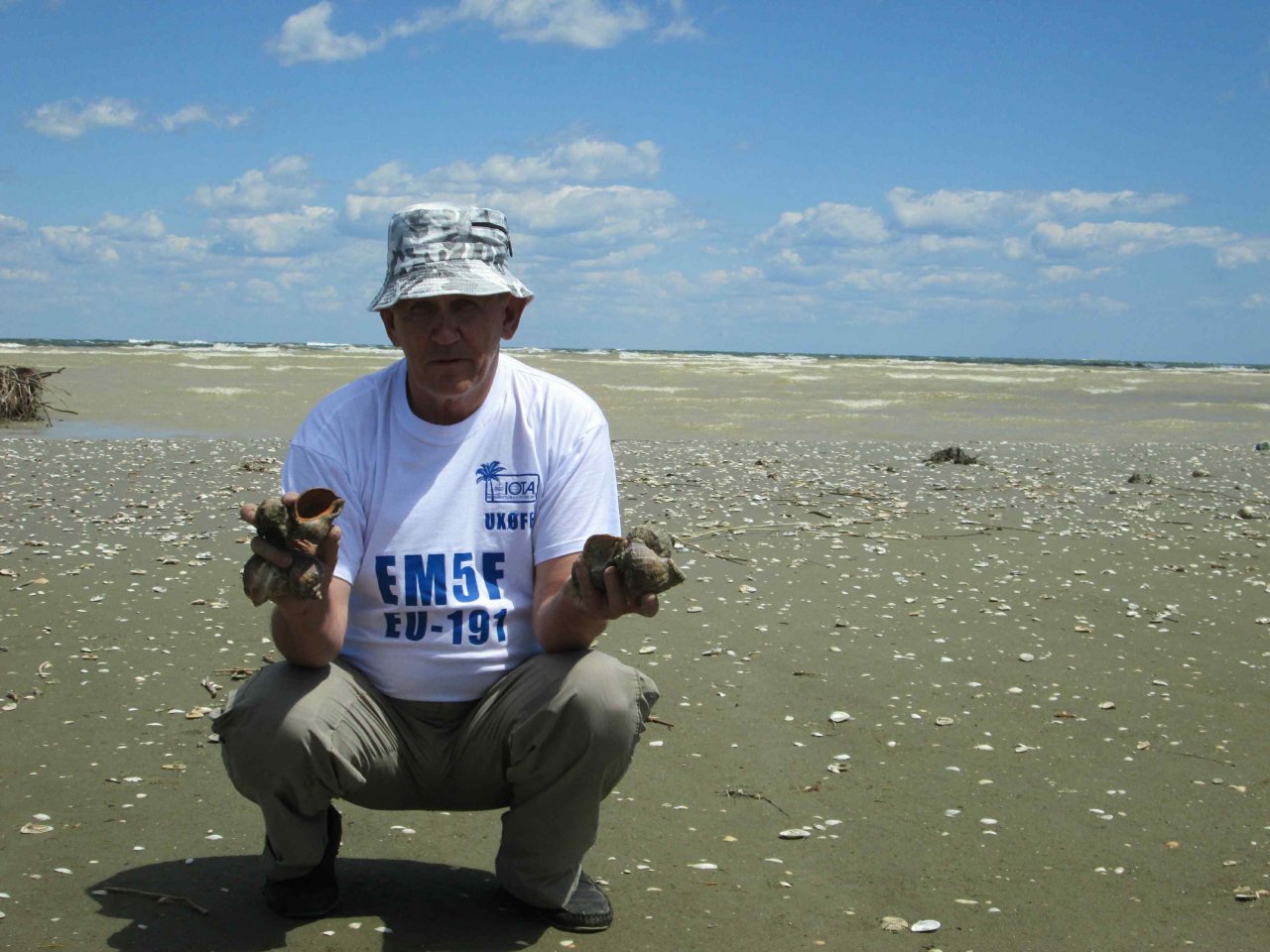 Сам остров – это песчаная коса и вся поверхность, пропитанная водой, становится явно некомфортной. Но, неудобства лишь нарастают: при запуске генератора обнаруживаем, что он медленно начинает проседать в песок от собственной вибрации. Вопрос решаем просто: находим пару прибившихся к острову веток от деревьев и переставляем генератор на них. Попытка установить стол для аппаратуры и стулья тоже не проходит. Все ножки сразу же уходят в песок чуть ли не до половины. И здесь выход находим практически сразу: на каждую ножку надеваем большие ракушки-улитки (Черноморские Рапаны). Их на острове много и эффект «на лицо» - уже можно сидеть. Периодически, правда, эти ракушки не выдерживают наш вес и раскалываются, приходится их менять на новые. Их насобирали про запас и держим возле ног.