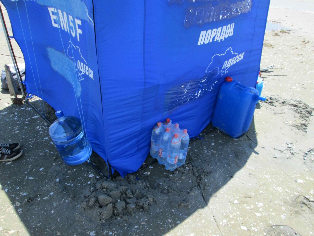 Для «шэка» мы используем стандартную агитационную палатку 2х2 метра. Конструкция вполне подходящая и единственный ее недостаток: одна сторона открыта. Андрей UR5FLF провел колоссальную работу по изготовлению трафарета и нанесению надписей EM5F, EU-191, URFF-006 и соответствующих логотипов на одной из сторон этой палатки. Это отчетливо видно на фото, которое мы использовали для лицевой стороны нашей QSL-карточки.