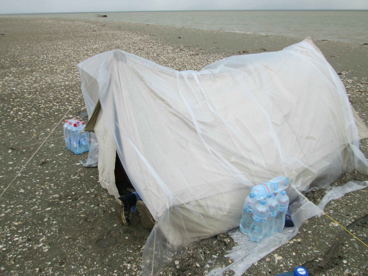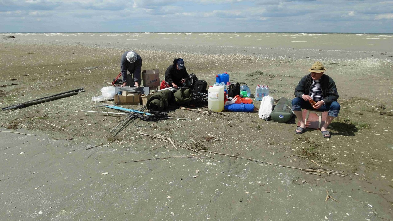 В этот момент мы обнаруживаем, что нарастает ветер и наша палатка начинает приподниматься! Останавливаем работу и пытаемся пару десятков заготовленных кольев из катанки диаметром 8 мм. и длиной около 50-60 см. воткнуть по периметру палатки и обеспечить фиксацию каркаса. Но ветер катастрофически нарастает и приходится просто стоять и держать ее за все трубы изнутри. Палатку для отдыхающей смены свалило и, чтобы ее не унесло совсем, оставляем сложенной, укрепив дополнительными кольями. Пытаемся обложить каркас «шэка» с ветреной стороны всеми канистрами. Но суммарных 140 литров явно не хватает. Ураган все нарастает и уже терзают смутные опасения, что скоро нас всех вместе с аппаратурой унесет в море. Пристраиваем распорку по диагонали внутри «шэка» из двух труб диаметром 47мм. и длиной 2,6м. Забиваем подпятник и укрепляем его кольями. Идея явно правильная: удерживать наш «шэк» в таком положении становится явно легче. Температура воздуха опускается до + 5°C, и вместе с ветром под 30 м./сек. явно напоминает начало нашей бессарабской зимы!