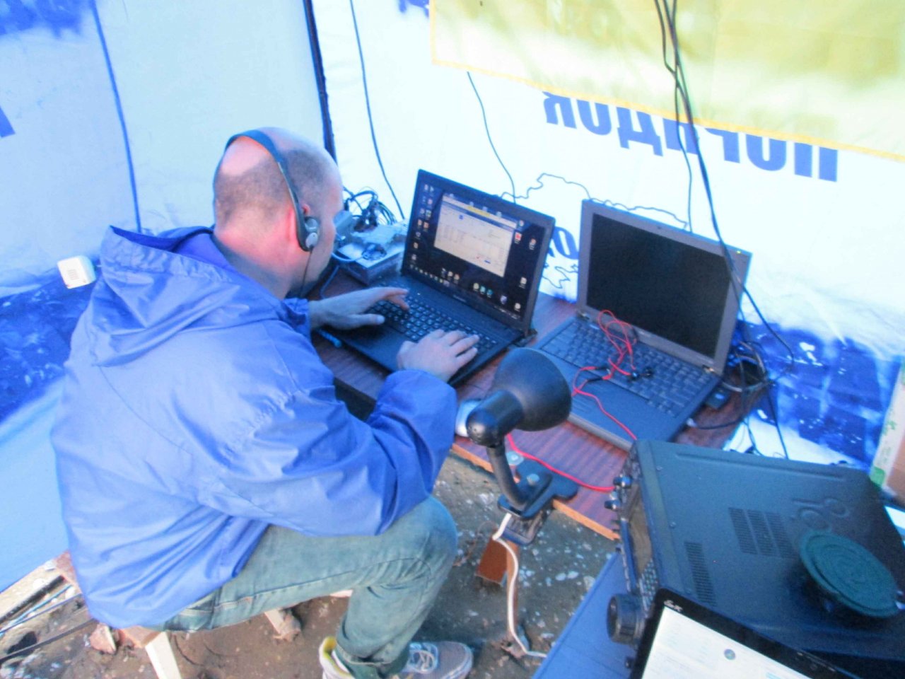 Дальше работаем по схеме: двое работают, а двое держат палатку, чтобы не унесло ветром.Работать в таких условиях просто нереально: ураган периодически захлопывает мониторы на лэптопах и валит столы с аппаратурой. Удерживать палатку даже после укрепления распоркой получается только вдвоем. Мы привыкаем к ветру, и нам кажется, что он немного стихает. Около 2:30 ночи Александр и Борис отправляются на отдых. Они заползают в прихлопнутую палатку и оценивают теплые качества американских спальников, которые мне дал для экспедиции мой приятель, со словами: «Будете спать голыми – иначе задохнетесь от жары!».