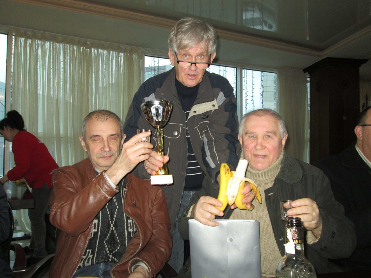После торжественной части удалось дружно пообщаться и соблюсти традиции -«обмыть» получены Кубки и Приз в баре неподалеку от места проведения Конференции. Несмотря ни на что удалось не опоздать на обратный рейс , хи. К 18 часам мы были доставлены на авто Владимира Федоровича UX5HYна автовокзал. За что также персональная Благодарность. Этим мы получили возможность, как минимум дополнительно один час для продолжить общения в такой дружеской обстановке ….