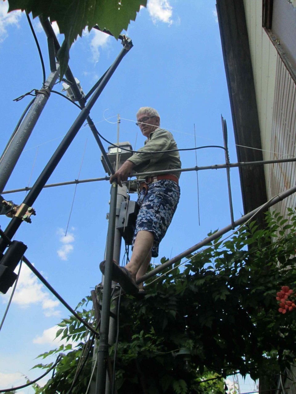 После восстановления КВ антенн пострадавших в январском урагане пришел к мысли, что надо добавить на эти антенны вариант поворота по элевации. При этом череда навалившихся домашних проблем подразумевала ограниченность во времени… Но все-таки уложился в одну неделю. Пришлось работать урывками. Антенны демонтировал сам. Телескоп позволяет провести основную часть работ самому. Конструкция для крепления 10 эл. волнового канала на 2м и 11 эл. на диапазон 70 см продумывалась с учетом уже установленного поворотного устройства. И – естественно - с учетом ураганов и гололедов , не редких в наших краях…
