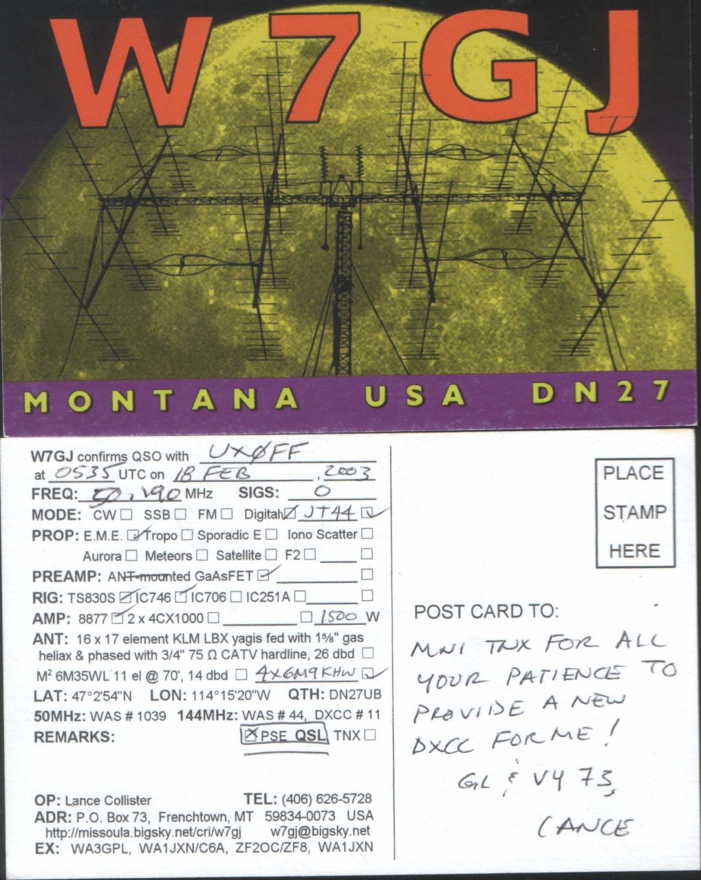 Напомню – свою первую «лунную» связь на 6 м я провел еще в 2003 г именно с W7GJ.