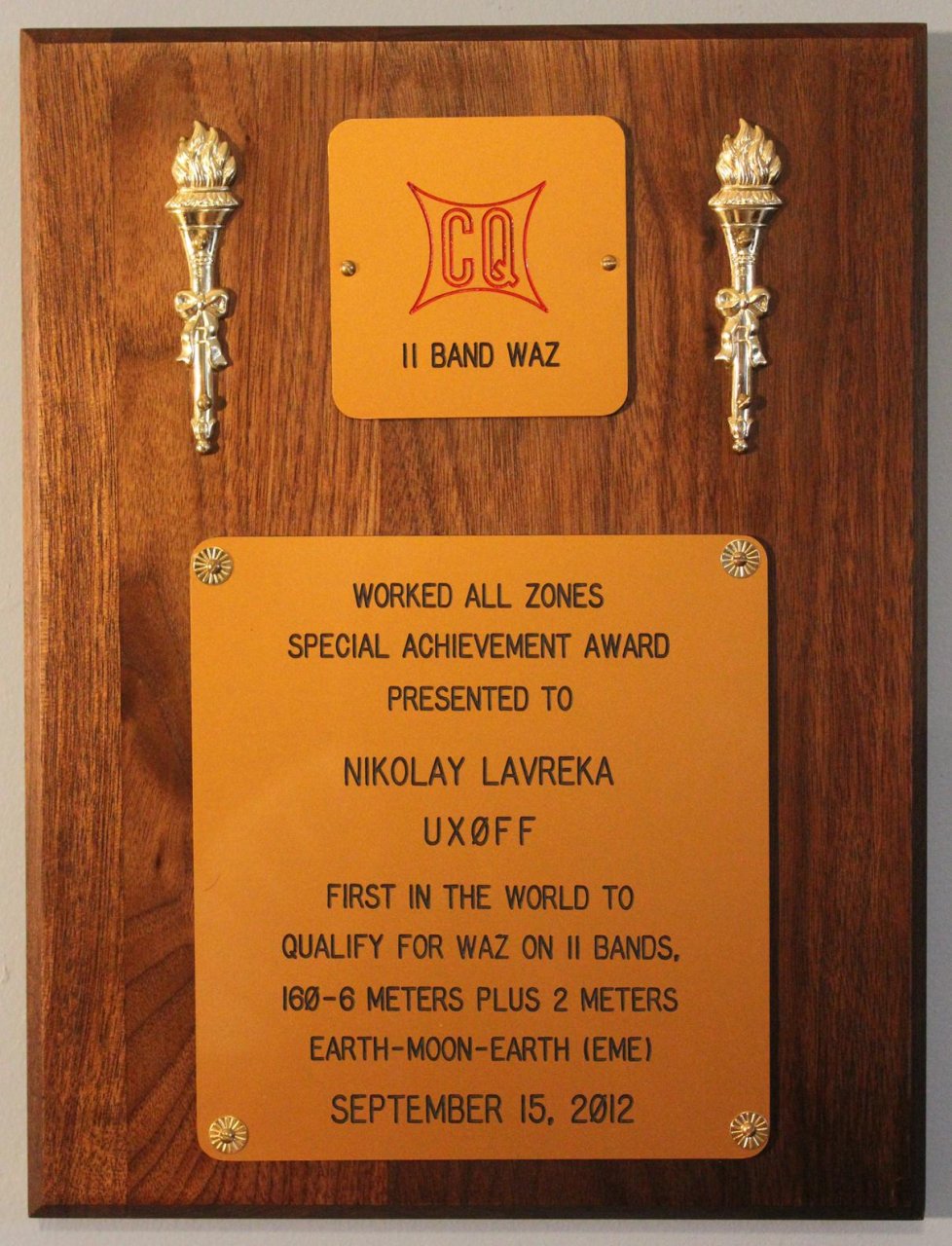 Свою Доску « 5 Bands WAZ», по сугубо экономическим причинам я получил лишь в 2012 году. Одновременно были получены «WAZ» за связи на 10 диапазонах . После этого появилась идея добить еще и 11-ый диапазон – «ЕМЕ»- на диапазоне 2м . Когда и он был получен – выяснилось что за всю Историю существования этого Диплома я был Первым, кто смог этого добиться. Тогда в журнале «CQ» появилась статья на 3 страницы под названием «Anamazing HAM» … Копию статьи прилагаю и желающие могут ее прочитать. Организаторы наградили меня специальной Доской «11 Bands WAZ - First in the World»