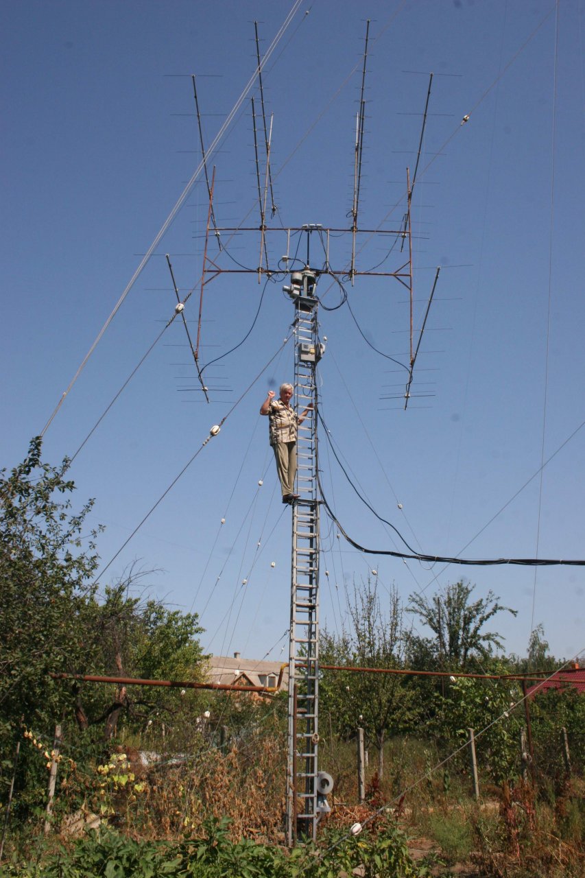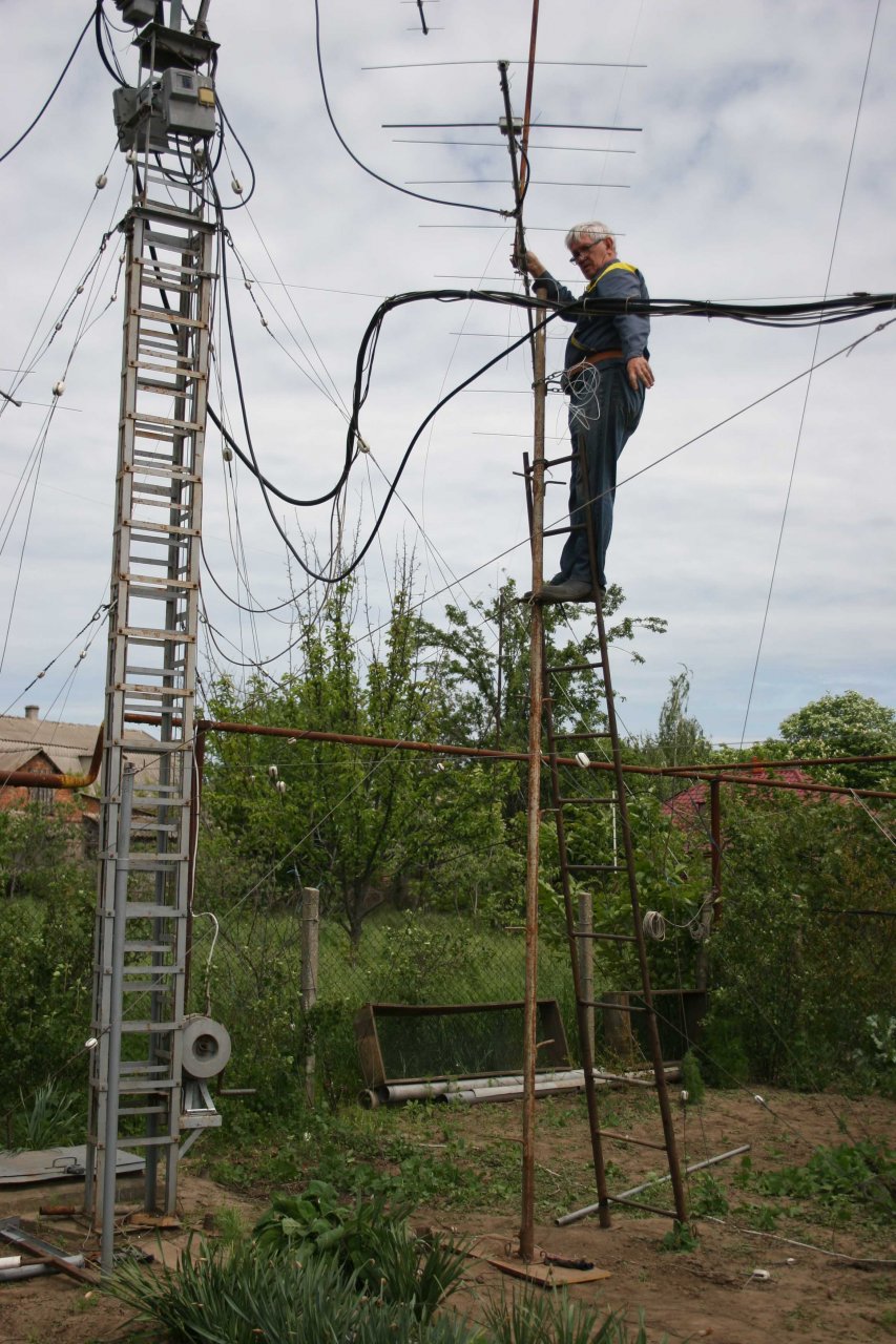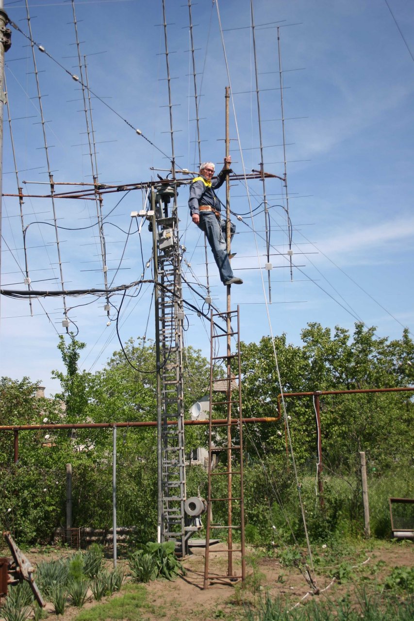 Мачта телескопическая и позволяет опустить весь комплект до 6 метров от центра траверсы до земли. А наличие узла для вращения всей рамы по элевации - позволяет поменять местами верхний и нижний ярусы. Естественно все это потребовало изготовление дополнительных мачт, подставок и т.д. Все это приходилось устанавливать с помощью друзей. В итоге – перебежками в течении апреля – мая месяца антенны удалось восстановить! Причем – завершить удалось в символичный для меня день - 15 мая. Это уже 14-я годовщина моего «полета» с 10 метровой мачты…Последствия этого «Полета» сильно сказываются и все эти ремонтные работы давались весьма не легко… И – как я уже написал в начале – были одним из главных аргументов мыслей о демонтаже антенн, ввиду не реальности их восстановления …