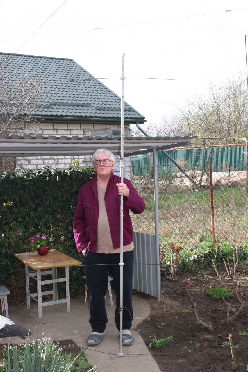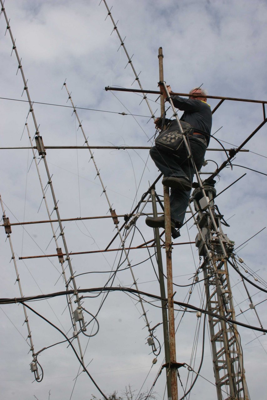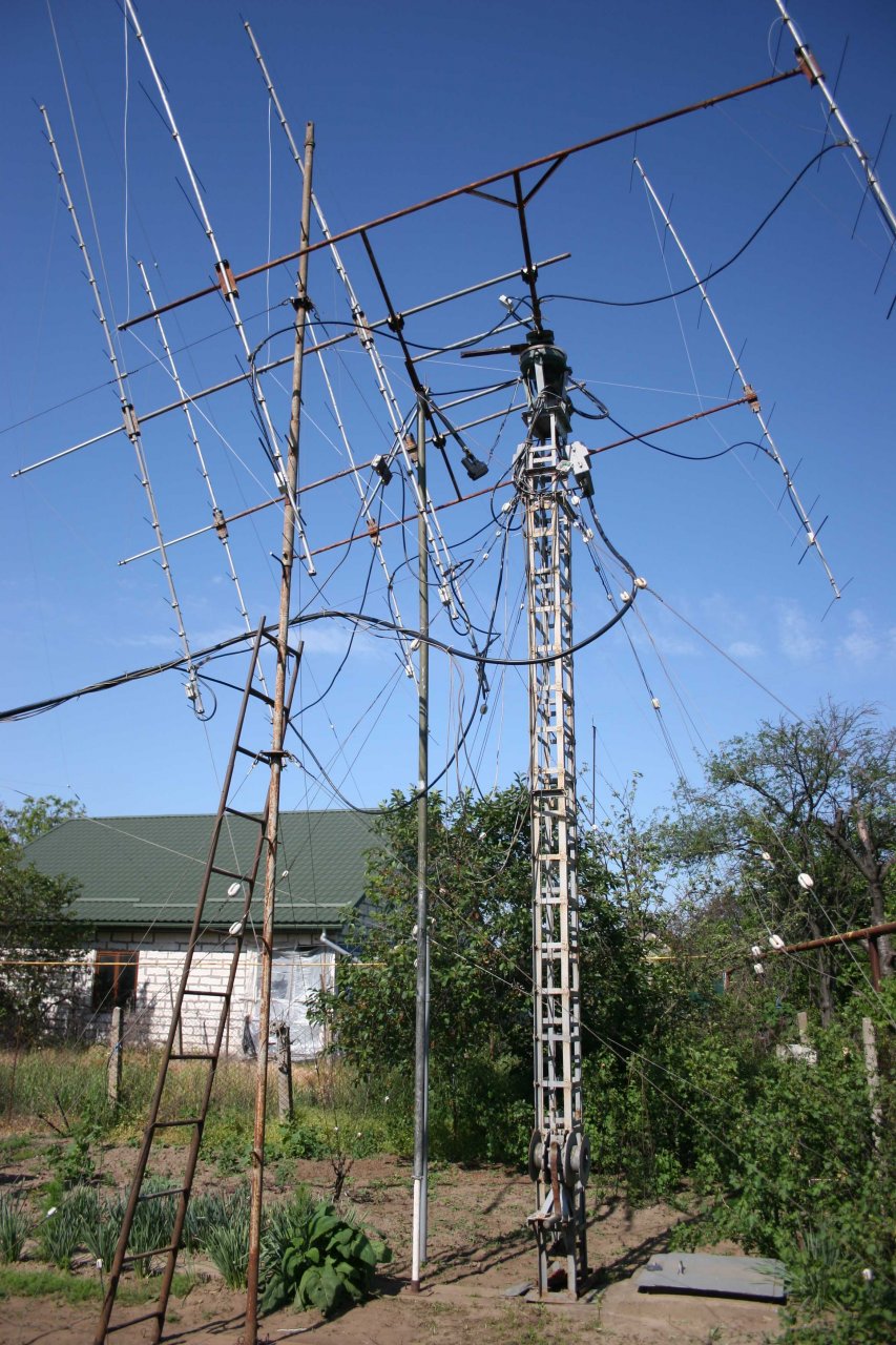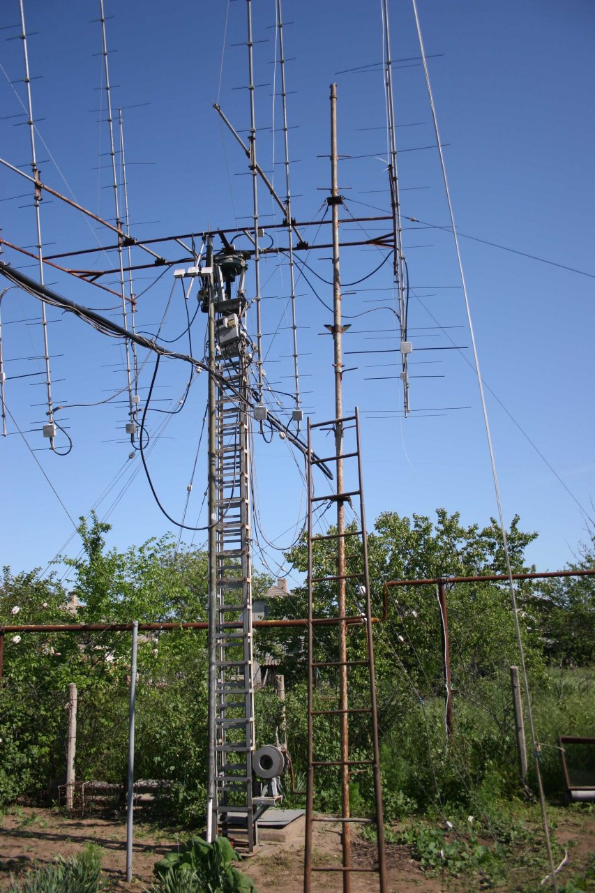 Мачта телескопическая и позволяет опустить весь комплект до 6 метров от центра траверсы до земли. А наличие узла для вращения всей рамы по элевации - позволяет поменять местами верхний и нижний ярусы. Естественно все это потребовало изготовление дополнительных мачт, подставок и т.д. Все это приходилось устанавливать с помощью друзей. В итоге – перебежками в течении апреля – мая месяца антенны удалось восстановить! Причем – завершить удалось в символичный для меня день - 15 мая. Это уже 14-я годовщина моего «полета» с 10 метровой мачты…Последствия этого «Полета» сильно сказываются и все эти ремонтные работы давались весьма не легко… И – как я уже написал в начале – были одним из главных аргументов мыслей о демонтаже антенн, ввиду не реальности их восстановления …