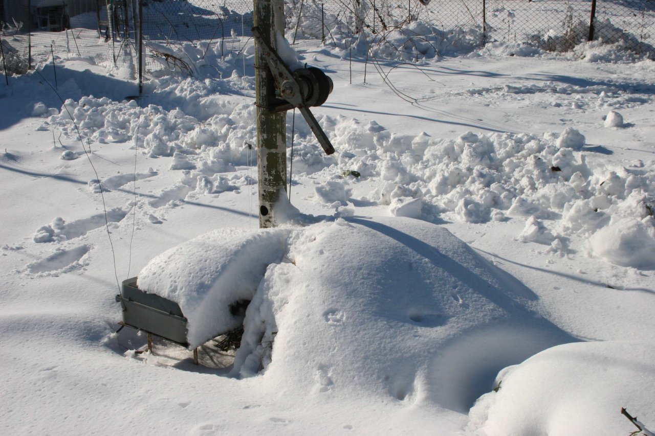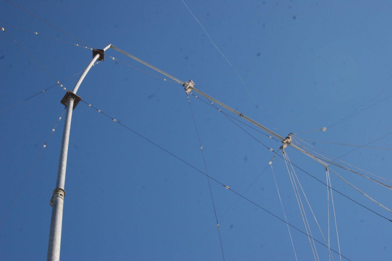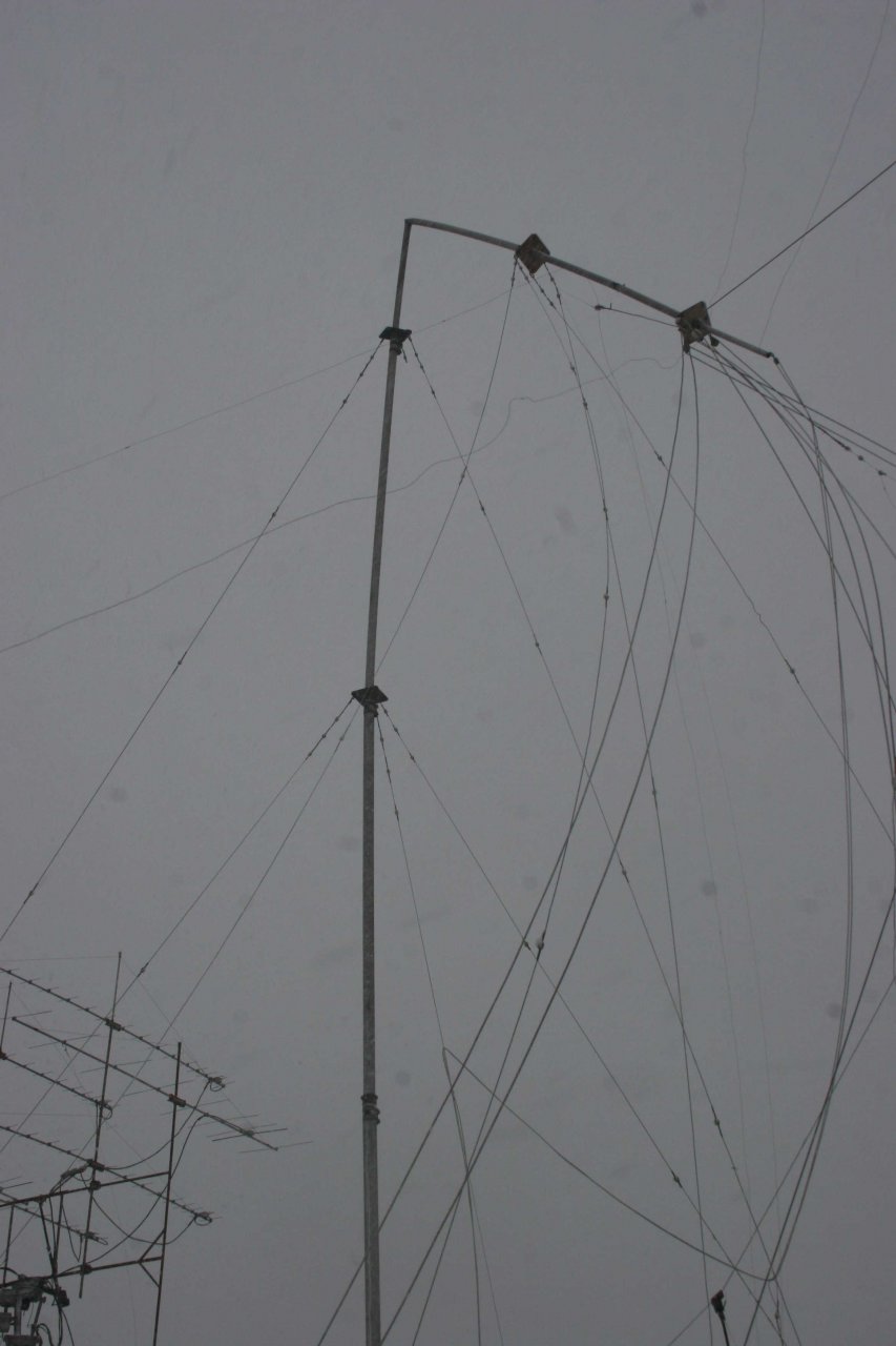 Через день ураган начал стихать и приступил к спасению хотя бы той части Верикала, что еще стояла. Обнаружилось что на уровне четвертой от земли секции - около 16 м оборвало 3-х мм трос растяжки и 8 ми метровая верхушка сильно ее гнула. Была реальная угроза загнуть и сломать еще и эту 5-ти метровую секцию диаметром 75 мм! Пришлось ее срочно спасть. Оставшиеся две растяжки перенес в противоположную от загнутой верхушки. Затем понял что верхушка может даже в таком положении доломаться и упасть не сразу. Но на ней были развешены 6 фалов длиной по 50 метров. Веревки намокли и обледенели и сильно увеличивали нагрузку. Решил часть фалов сразу стянуть. Но и это оказалось не просто. Все в момент падения переплелось и запуталось. Напомню что на этом вертикале еще были развешаны два луча по 84 метра на соседние улицы через несколько соседских огородов. Еще «Дельта» диапазона 30 м и 80 м. И - 18 метровая добавка к Вертикалу. А вокруг – куча растяжек от остальных мачт и антенн. В общем один полный день не хватил, что бы это все растянуть. постепенно пришел к мысли, что можно продолжить использовать и этот вариант. На этом вертикале сосредоточены все мои антенны НЧ диапазонов – 10-7-3,5-1,8 мс Квадраты ВЧ диапазонов пока слава Богу выстояли.