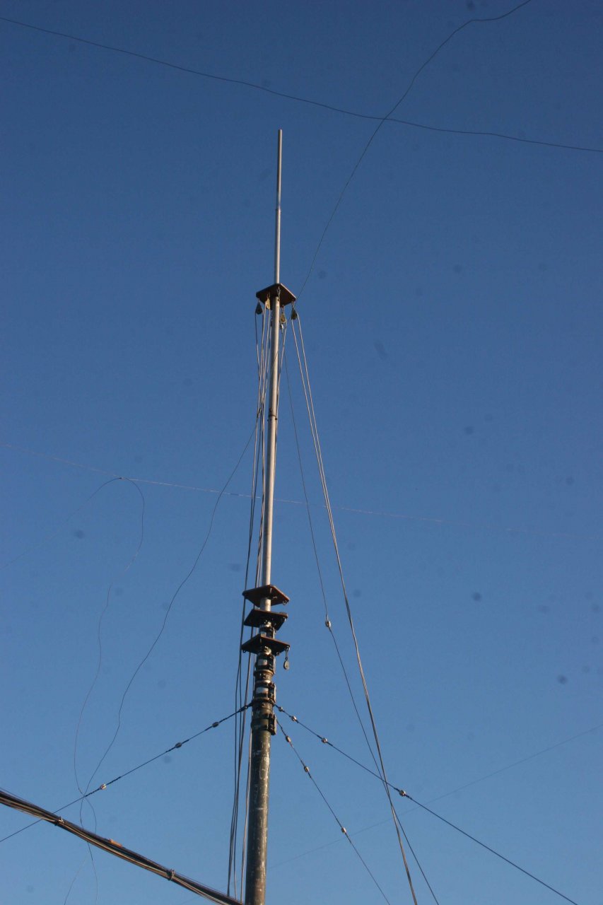 Удалось собрать вертикал 25,5 м. Но пришлось отказаться от удлиняющей 18 м добавки . Решил перенести эту линию снизу телескопа. Она тянула верхушку с южной стороны, что усиливало процесс слома в ноябре … Так же добавил вместо одного веревочного фала растяжку из 3-х мм троса с северной стороны. Много раз этот Вертикал ломал именно северный ураган. Теперь есть шансы, что простоит намного дольше…