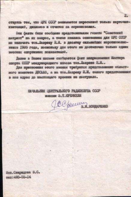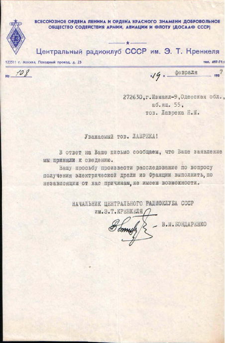 Естественно, изначально я обратился в ЦРК СССР с Заявлением, что никакой эл. дрели никогда не просил. Потребовал направить Запрос в адрес этого француза, с целью выяснения причин отправки этой дрели. При этом – подчеркнул, что в ближайшие месяцы будет подведение очередной «Десятки сильнейших» радиспортсменов года СССР» и попросил учесть мое категоричное Заявление о непричастности – при подведении Итогов. А так же – направить ответ в Одесский Обком ДОСААФ, т.к. процесс с Представлением остановлен - со ссылкой на письмо ЦРК СССР... Почта и технологические сроки тех лет подразумевали неспешное развитие ситуации. Спустя пару месяцев был получен ответ, что мое Заявление принято к сведению. Но, по не зависящим от ЦРК причинам, провести расследование и отправить запрос там не могут... При этом , полковник Ельников наотрез отказался подписать новое Представлении. А, спустя еще пару месяцев, в журнале «Радио» появились и Итоги «Десятки сильнейших» 1985 года, где моего позывного (тогда – RB5FF) уже не было. Хотя, нетрудно было сосчитать, что реально наработал в контестах на 2-е место и был следующим за легендарным UA1DZ... Как стало понятно, уже после получения копии письма – вопрос с изгнанием меня из данной «Десятки» был решен еще в декабре...