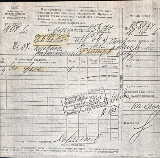 По моей просьбе Павел Михайлович «подключает» к процессу своего друга - Альфреда Николаевича Баркова (UT5AB, ныне – S.K.) и делается официальный Запрос. Вскоре, был получен официальный ответ Московской таможни, где было указано в графе получатель: УБ5FAF – Alex .(полу-русскими – полу- английскими буквами!) А в графе отправитель было указано «обтекаемое»: «Позывные радиолюбителя Франции». К этой «досмотровой росписи» прилагалось и пояснение ЦРК СССР – мол произошла ошибка и позывной не мой и имя не мое... Как потом выяснилось – просто «проморгали», что позывной UB5FDF был мною сменен еще в 1984 г. (в ходе очередной реформы позывных) на RB5FF..