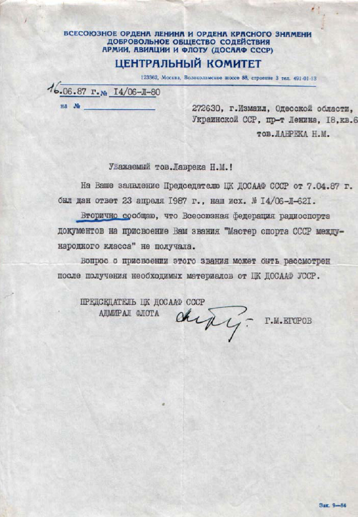 Казалось бы, - Правда восторжествовала?! Я, тоже верил, согласно воспитанию, отправляя очередное Заявление в ЦРК СССР и прилагая копии их же ответов. В ответ – приходит лаконичное: «Для присвоения Звания мы должны получить соответствующие документы! В адрес ЦРК СССР – документов не поступало!» Искренне удивляясь и пишу еще раз: «В Одесском обкоме ДОСААФ отказываются подписать Представление - ссылаясь на письмо ЦРК!». Прошу выслать новое письмо в Одессу (с опровержением предыдущего письма). Спустя пару месяцев – приходит все тот же ответ: «Для получения – необходимы документы, которых к нам не поступало!»