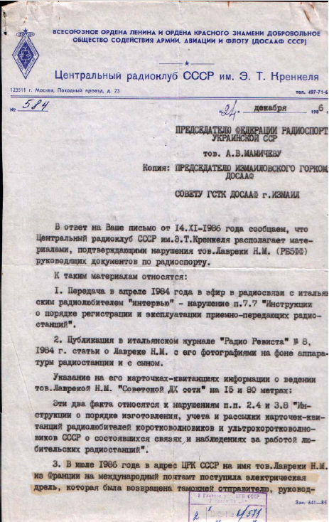 Предыдущее летнее письмо, в газету «Советский спорт», тоже не прошло бесследно - в закрытый пограничный город Измаил прилетает ст. инженер ЦРК СССР А. Лысиков, для проверки моей радиостанции на предмет превышения мощности. Визит был приурочен к IARU – 1986 и ст. инженер присутствовал около часа, пока я успешно заканчивал работу на разрешенной (благодаря UA1FA) ГУ-74Б. При этом, Анатолий оказался порядочным человеком и высказал удовлетворении, что хоть меня не придется «закрывать». До этого, он по аналогичному распоряжению начальника ЦРК СССР, вылетал в Туркмению к UH8EA. Итогом – наверное многие помнят явилось закрытие Виктора и пресловутая статья в журнале «Радио» «Липовый Чемпион»!