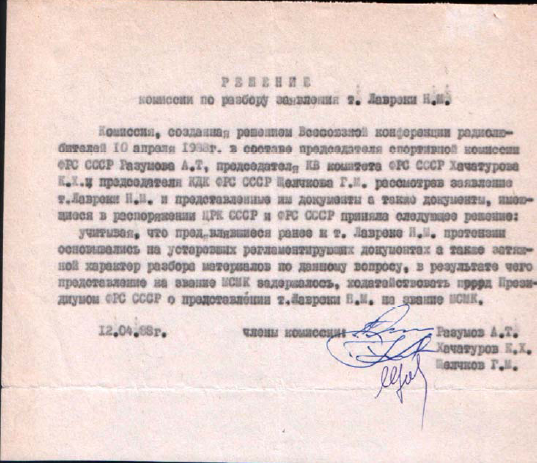 Остальные участники той конференции могут оценить ситуацию лучше, особо находившись тогда в зале. Понимаю, что приходится менять тактику – пишу Заявление в Президиум конференции, с просьбой создать комиссию и рассмотреть имеющиеся у меня неопровержимые доказательства клеветы со стороны ЦРК СССР. Передаю входящему делегату и в щелочку двери вижу, как мое Заявления передают в Президиум, в котором – уважаемые люди: председатель ФРС СССР – зам. министра Связи СССР – Зубарев, главный редактор журнала «Радио» - А.В. Гороховский (ныне – S.K.). Вижу, как Константин Хачатуров (UW3AA, ныне - RT3A) передает мое Заявление Гороховскому. Жду – когда зачитают?! В перерыве спрашиваю Константина – почему не зачитали?! Он возвращается с явным недоумением: « Гороховский сказал что не видел никакого Заявления!» «Но, ведь ты же сам видел – я ему передавал!» Ну что же – и этот излюбленный «прием» - «положить под сукно» мы уже проходили не раз ... Пишу второе Заявление. Опять – та же цепочка. Внимательно слежу и повторно убеждаюсь – Заявления у Гороховского. Опять перерыв и – опять ответ Гороховского; «Не видел никакого Заявления!» Пишу третье Заявление. На Трибуне Георгий Ходжаев (UA4PW, ныне – S.K.). Удается каким-то чудом, в наглую проскочить сквозь боковую дверь на трибуну. Ложу перед ним Заявление и прошу: «Георгий Христофорович! Зачитайте вслух, пожалуйста!» В зале явно нарастает напряжение. Попытка помешать – не удалась. Сказывается его радиолюбительский авторитет и Статус звания «Засл. деятель Тат. АССР»... После зачитывания Заявления начинается явно процесс, выходящий за рамки понимания «полковников» – на попытку какого-то генерала стукнуть кулаком по столу и скомандовать «Молчать» - зал отвечает дружным хохотом... Меня наконец, по требованию народа, впускают официально в зал Конференции. Генерал ошалело оглядывается по сторонам – ища поддержки у тех упитанных офицеров в штатском, что стойко охраняли от нас вход на Конференцию. Напряжении в зале растет. Народ настроен явно идти до конца и требует немедленного создания Комиссии. Надо отдать должное зам.министра Зубареву – он, не вникая в саму суть, предложил вполне логический компромисс: «в таких условиях вы все равно не разберетесь!» И – предложил Комиссию утвердить на Конференции, но все разбирательства провести в понедельник, после ее окончания. Мне многие говорят: «Не соглашайся! Потом - когда все разъедутся, - ты вряд ли добьешься Правды ...» Но получаю твердое заверение от Зубарева, что он гарантирует не предвзятый процесс разбирательства – соглашаюсь... Попутно – удается пообщаться с прибывшим на Конференцию корреспондентом «Комсомольской правды» и заручиться его обещанием, при необходимости опубликовать все в «КП»... В понедельник прибываю в ЦРК СССР. Голоса просто нет. Несколько ночей, проведенных на полу в гостинице, привели к тому, что едва удается выдавливать слова полу шепотом – полу хрипом... В комиссии - трое: Константин (UW3AA) и два штатных работника ЦРК, далеко пост пенсионного возраста. И – как потом выяснилось – самолично подписавших несколько десятков писем ЦРК СССР, скопившихся за эти годы ... Понимая, что передо мною в общем то уже не молодые, туго соображающие пенсионеры, начинаю выкладывать все медленно и логично: Вот письмо ЦРК СССР, с которого все началось. В нем 3 пункта «обвинения».
