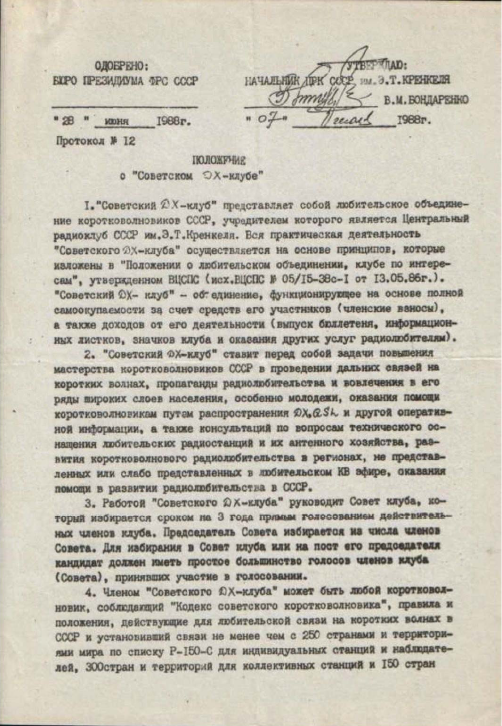А, все, что творили в этой «Системе» – было рассчитано на то, что ни один нормальный человек не сможет дойти до конца по «замкнутому кругу» и просто плюнет и смирится... Или – традиционно сопьется от всей происходящей безысходности... Полученный, при этом, бесценный опыт борьбы с «Системой», позже, не один раз пригодился в жизни. Возможно, появится еще вдохновение и опубликую еще ряд воспоминаний... Имеются еще ряд аналогичных папок ... В средине 1988 г. ЦРК СССР разрешает еще и существование U-DX-C (сохранился этот исторический Документ). Надеюсь многим будет интересно почитать и вспомнить – «Как это было?»
